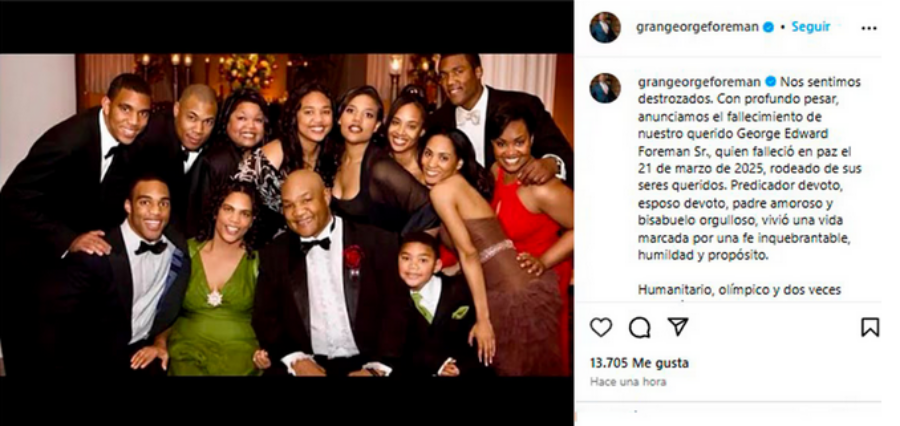 “Con profundo pesar, anunciamos el fallecimiento de nuestro querido George Edward Foreman Sr., quien falleció en paz el 21 de Marzo de 2025 rodeado de sus seres queridos. Predicador devoto, esposo, padre amoroso y bisabuelo orgulloso, vivió una vida marcada por una fe inquebrantable, humildad y propósito”, expresaron sus familiares en el mensaje compartido.
