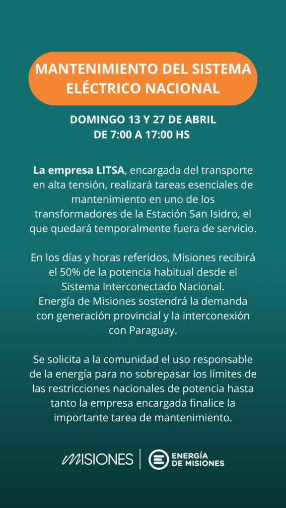 En los días y horas referidos, Misiones recibirá el 50% de la potencia habitual desde el Sistema Interconectado Nacional.