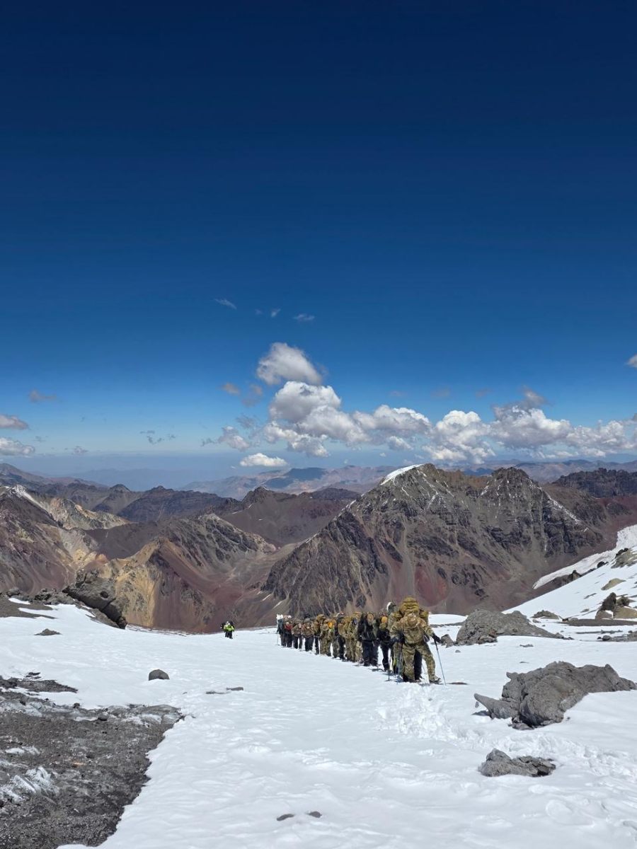 El Tras una exigente jornada de ascensión final, el Agrupamiento “Ejército de los Andes”, una cordada integrada por 33 militares de ambos países, alcanzó con éxito la cumbre del Cerro Aconcagua, a 6.961 metros sobre el nivel del mar, culminando una fase importante de la Expedición Andinística Argentino–Chilena.