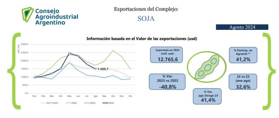 En el caso de la oleaginosa, las ventas durante 2024 fueron por 12.765,5 millones de dólares, una mejora de 32,6% en relación a los primeros ocho meses del año.