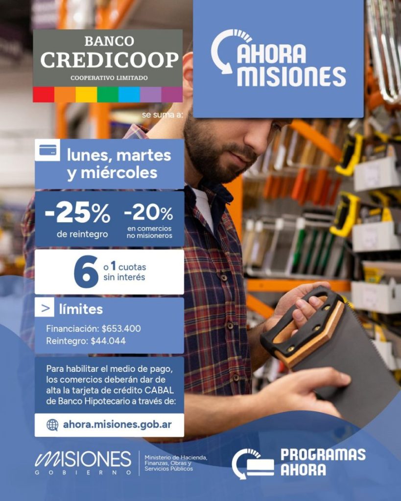 El Programa Ahora Misiones está vigente todos los lunes, martes y miércoles y ofrece financiación en 1 o 6 cuotas sin interés, con un límite financiable de 653.400 pesos; y reintegros de 25% (20 % en comercios no misioneros) con un tope de 44.044 pesos.