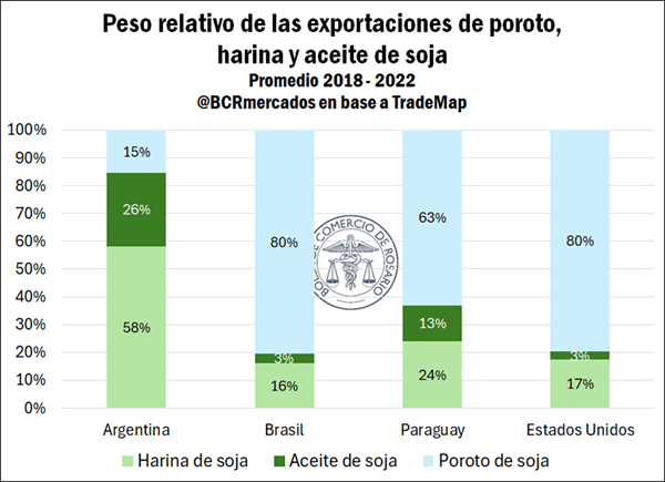 Estos países - junto con Argentina - representan el 87% de las exportaciones globales de harina de soja de los últimos cinco años. En paralelo, explican también cerca del 70% de las exportaciones mundiales de aceite de soja y más del 93% del comercio global de poroto de soja.