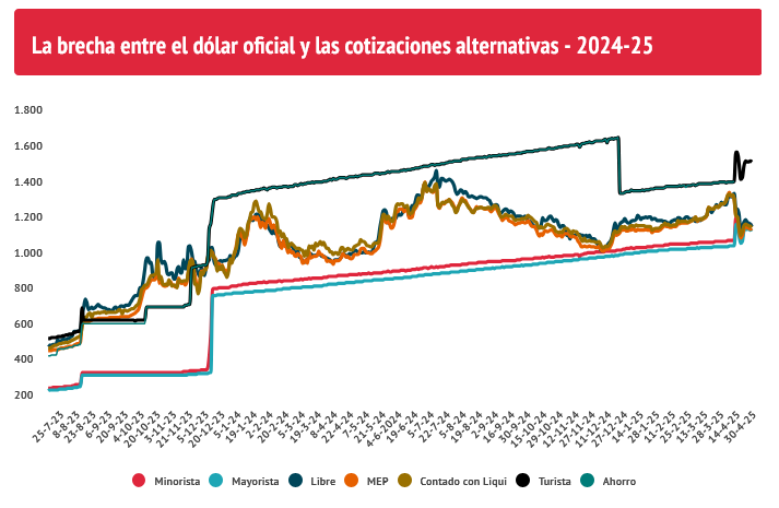 En ese período el dólar “blue” se disparó 135 pesos o un 10,9%, desde los 1.240 pesos a 1.375 pesos, mientras que las paridades bursátiles alcanzaron el umbral de los 1.360 pesos que no se registraba desde Julio de 2024.