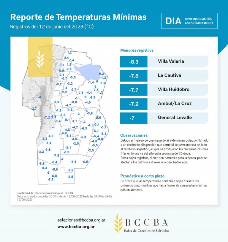 En el caso particular de Córdoba, por ejemplo, la Administración Provincial de Recursos Hïdricos (APRHI) reportó como valor más bajo del día -7,6°C en la localidad de Los Reartes, en la zona serrana; mientras que entre las regiones agrícolas, el menor guarismo fue -6,6° en Nicolás Bruzzone, en el extremo sur de la provincia.