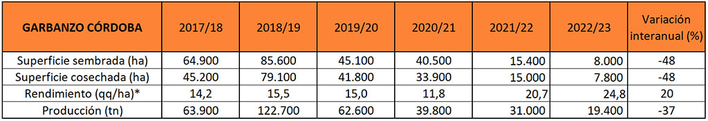 Con una superficie sembrada de 8.000 hectáreas, de las cuales se cosecharon 7.800, la producción de garbanzo en Córdoba en la campaña 2022/2023 arrojó una producción de 19.400 toneladas, con un promedio de rinde de 24.8 qq/ha.
