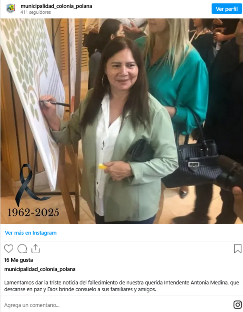 Al respecto, las redes sociales del Municipio publicaron: “Lamentamos dar la triste noticia del fallecimiento de nuestra querida intendente Antonia Medina. Que descanse en paz y Dios brinde consuelo a sus familiares”.