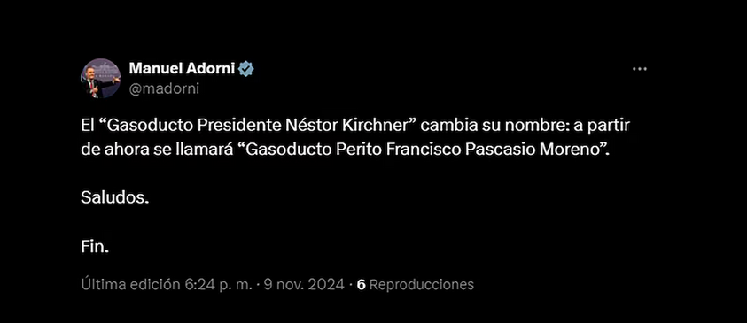 El Gobierno Nacional oficializó este lunes el cambio de nombre del ahora ex Gasoducto Néstor Kirchner y pasará a llamarse Perito Francisco Pascasio Moreno. Se trata de una nueva medida que lleva adelante la gestión del Presidente Javier Milei en el marco de su primer año de mandato, luego de lo que ocurrió con el ex Centro Cultural Kirchner, que cambió de nomenclatura por el Palacio Libertad.