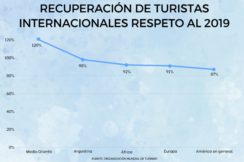 Afortunadamente para la industria, el panorama se ha vuelto alentador y, de hecho, según datos de la Organización Mundial de Turismo, Argentina ocupa el segundo lugar entre las naciones que muestra una importante recuperación de turistas internacionales con respecto al 2019, exactamente de un 98%.
