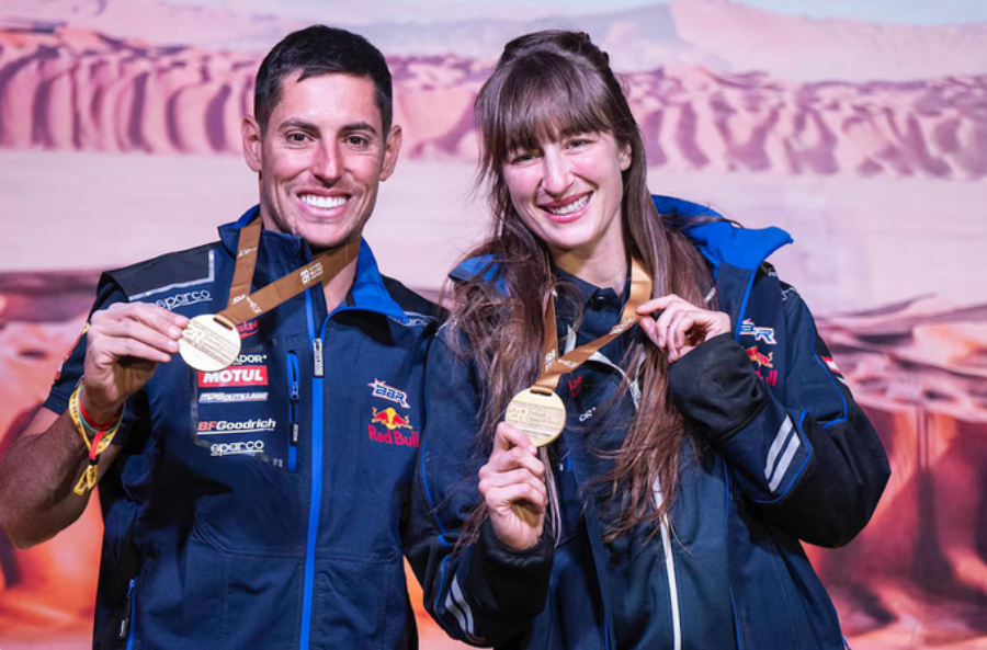 Ambos con las medallas que reciben los ganadores de etapa. En esta edición se quedaron con tres parciales. Para tener ese reconocimiento, además, deben correr todo el Campeonato Mundial de Rally Raid y los cordobeses lo hicieron en 2024 (Crédito: Shakedown Team)