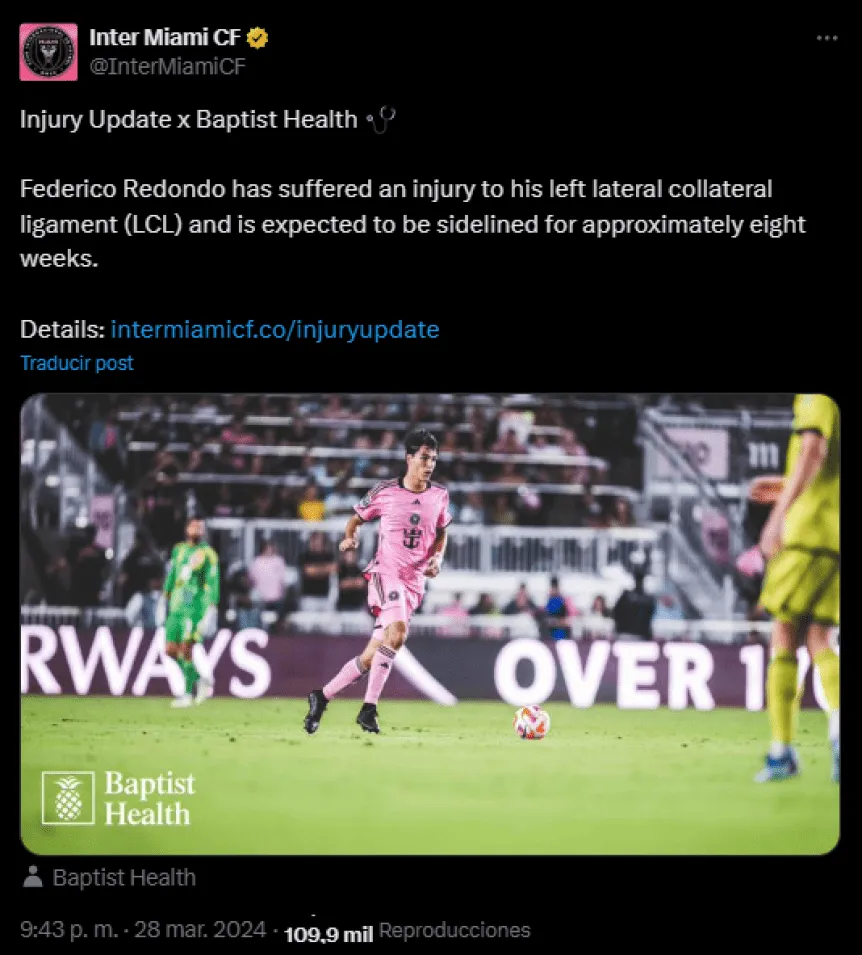 El tweet de Inter Miami para informar la lesión ligamentaria de Federico Redondo.