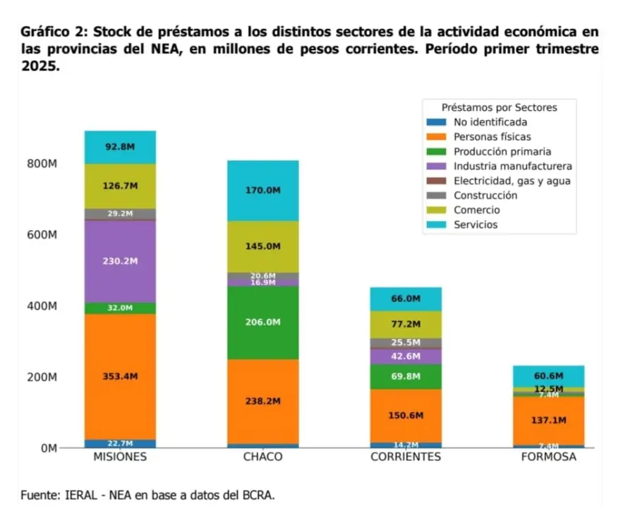 Un informe de la Fundación Mediterránea analiza el stock de préstamos en las provincias del NEA, evaluando el nivel de financiamiento e inversión en términos reales, es decir, ajustados por inflación, durante los últimos años. Según el estudio, Misiones es la provincia con mayor volumen de créditos otorgados a la actividad económica, con aproximadamente 891 millones de pesos, seguida por Chaco con 807 millones, Corrientes con 450 millones y Formosa con 230 millones.