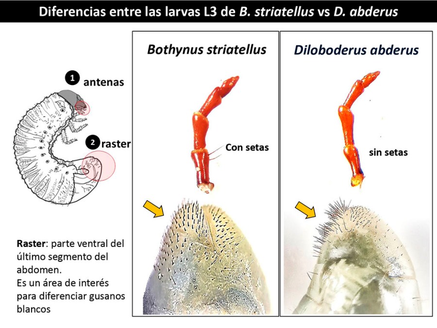Figura 1. Caracteres morfológicos diferenciales entre Bothynus striatellus y Diloboderus abderus en estadío larval L3. Créditos: Niveyro, S.