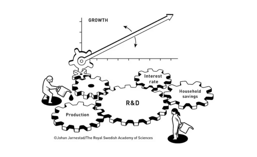 El modelo de Aghion y Howitt muestra que existen fuertes fuerzas que tiran en diferentes direcciones en lo que respecta a la inversión en I+D y, por lo tanto, al crecimiento económico. Dependiendo de factores como el mercado y el período de tiempo, la necesidad de subvencionar la I+D puede variar. (©Johan Jarnestad/Real Academia Sueca de Ciencias)