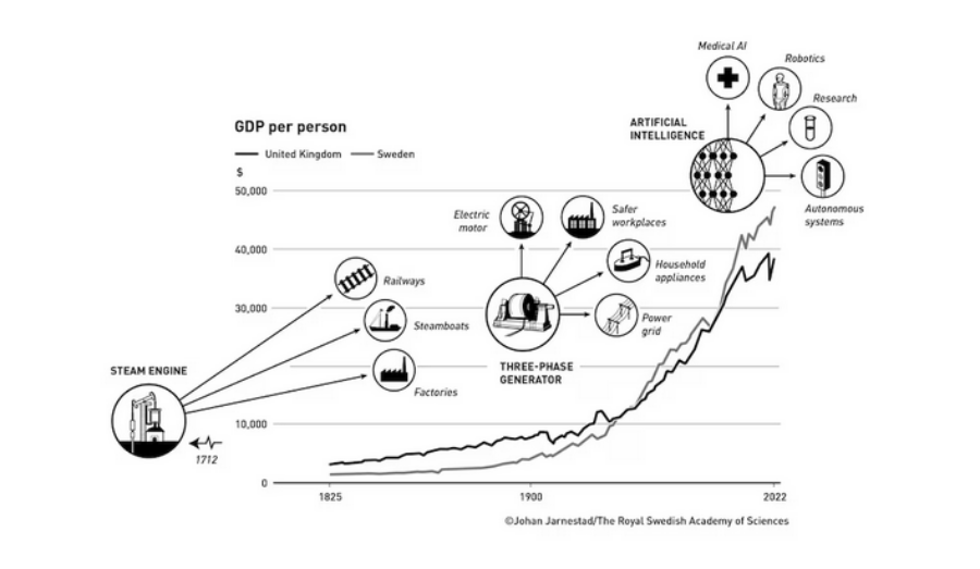Durante los últimos 200 años, el crecimiento anual ha sido de alrededor del 1,5 % en Suecia y el Reino Unido. Las innovaciones tecnológicas y los avances científicos se han complementado mutuamente en un ciclo sin fin. Datos: Base de datos del Proyecto Maddison 2023 con fuentes subyacentes de Broadberry et al. (2015), Krantz (2017), Schön y Krantz (2015). (©Johan Jarnestad/Real Academia Sueca de Ciencias)