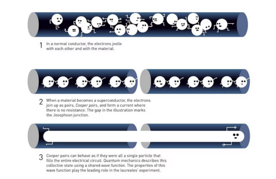 Los físicos se preguntaron rápidamente si sería posible investigar un tipo de efecto túnel que involucrara más de una partícula a la vez. Los laureados utilizaron superconductores, materiales en los que los electrones individuales se organizan formando pares, llamados pares de Cooper. Estos pares se comportan de manera completamente diferente a los electrones ordinarios y pueden describirse como una sola unidad, un sistema de mecánica cuántica.