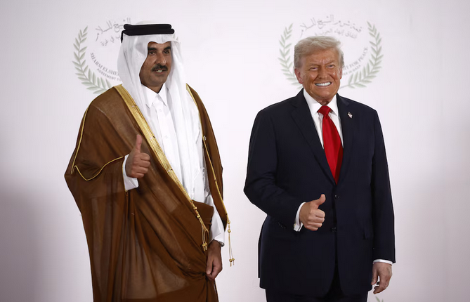Donald Trump junto al Emir de Qatar Sheikh Tamim ibn Hamad Al Thani (Yoan Valat/Pool via Reuters)
