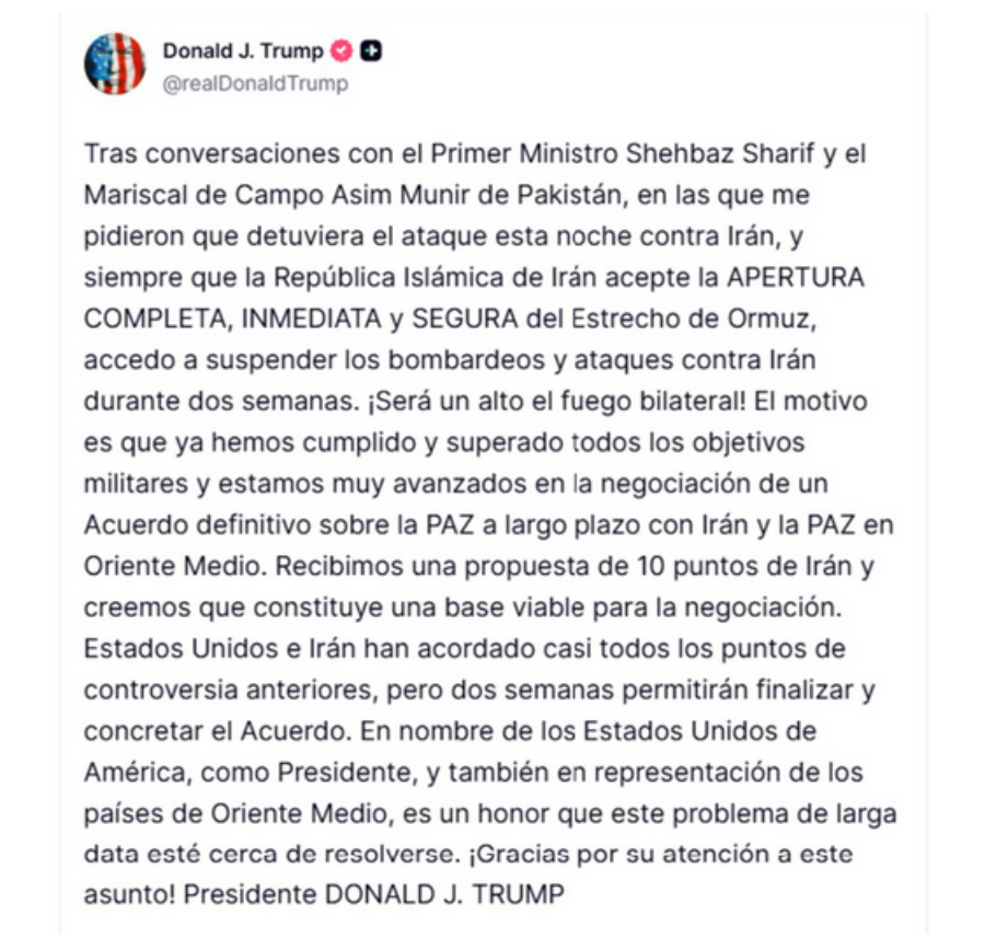 Trump anuncia la suspensión de ataques contra Irán y el progreso hacia un acuerdo de paz a largo plazo en Oriente Medio, condicionado a la apertura del Estrecho de Ormuz