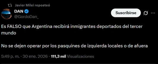 “Es FALSO que Argentina recibirá inmigrantes deportados del tercer mundo. No se dejen operar por los pasquines de izquierda locales o de afuera”, escribió Parisini, mensaje que el propio Milei replicó, como una forma de dar por cerrada la versión.