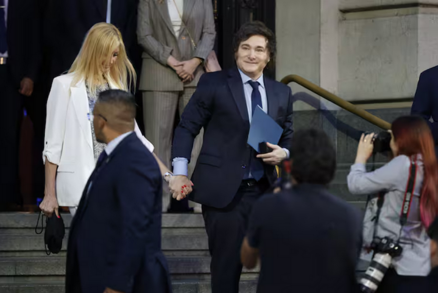 El Presidente Javier Milei se retira del acto por el cambio de nombre del exCCK acompañado por su pareja, Amalia "Yuyito" González - Foto Rodrigo Néspolo - LA NACION