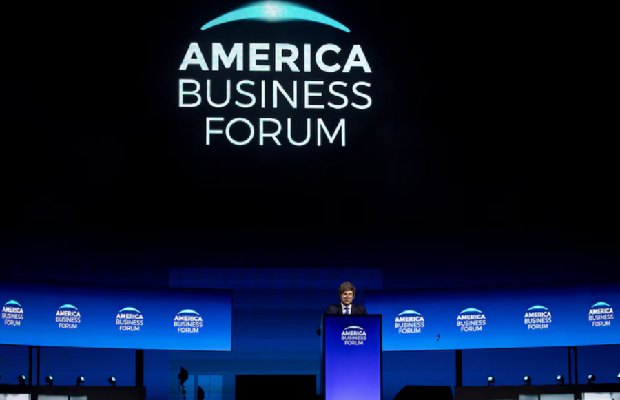 Javier Milei elogió a Donald Trump y Lionel Messi en su discuso en el America Busness Forum. Foto - Reuters/Marco Bello
