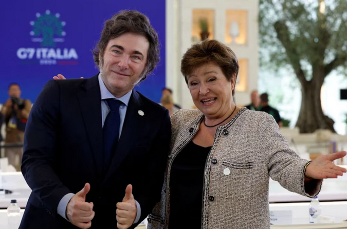 La Directora Gerente del FMI, Kristalina Georgieva, y el presidente de Argentina, Javier Milei, conversan en el segundo día de una cumbre del G7 en Borgo Egnazia, Italia, el 14 de Junio de 2024. Reuters/Louisa Gouliamaki