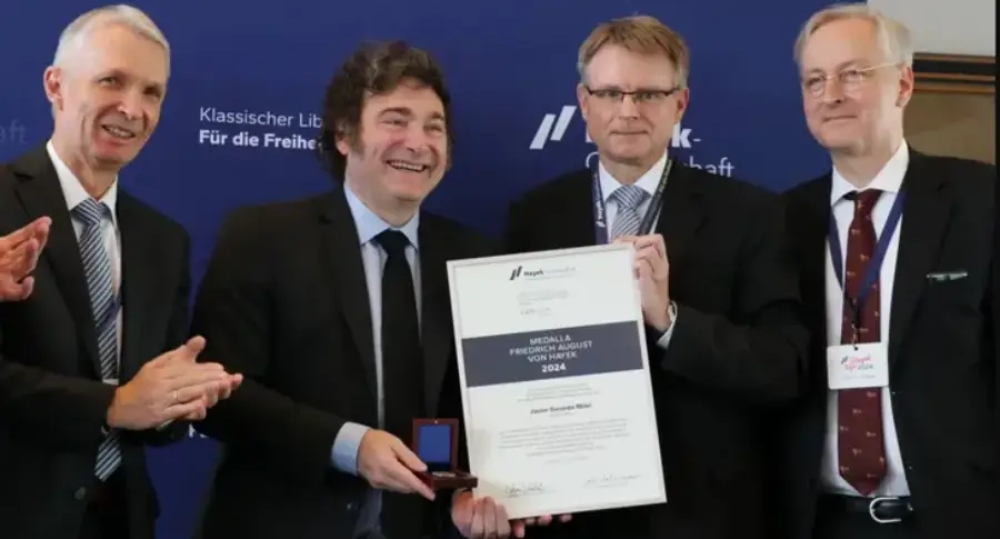 El Presidente Javier Milei recibió el sábado en la ciudad de Hamburgo, en el norte de Alemania, una medalla de la Sociedad Hayek, de corte neoliberal, que considera que el mandatario lidera un cambio de curso fundamental para “liberar de grilletes” a la población y devolverle “la esperanza”.