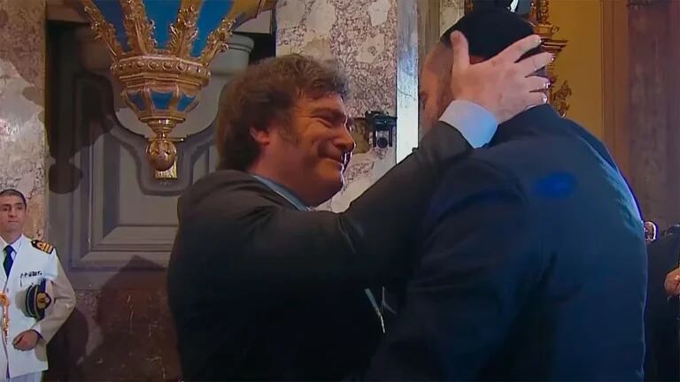 Al concluir la ceremonia interreligiosa en la Catedral, Javier Milei se abraza con su rabino Shimon Axel Wahnish, designado embajador de Argentina en Israel