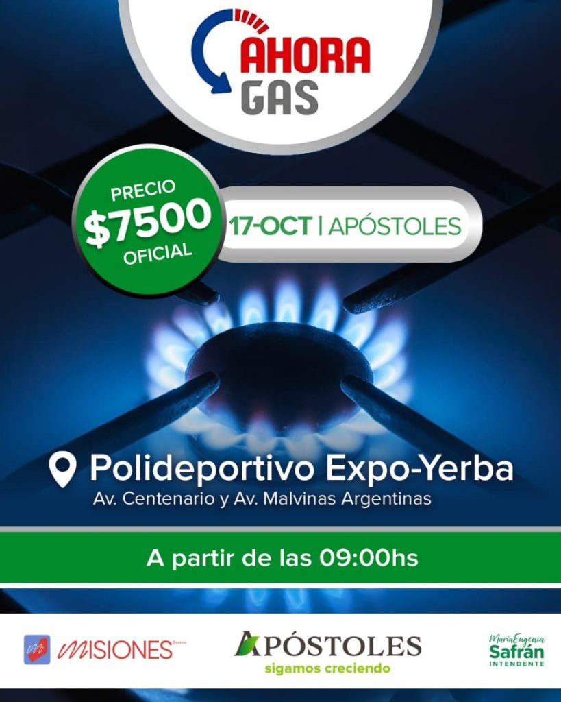 El Programa Provincial Ahora Gas llega al Municipio misionero de Apóstoles con precios bajos para ayudar a los vecinos, será el próximo día jueves 17 de Octubre desde las 9 horas en el predio de la Expo Yerba