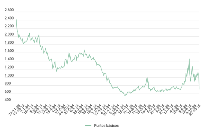 El riesgo país de Argentina, incluido en el JP Morgan Global Diversified Index, se desplomó más de 400 puntos básicos, a 708 puntos, un mínimo desde mayo. El viernes previo a los comicios el indicador había cerrado en 1.081 unidades, por lo que se redujo en 373 unidades.