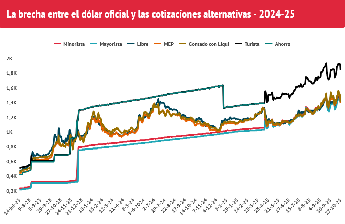 “Durante el desarrollo de la rueda, el tipo de cambio alcanzó la zona de 1.385 pesos, donde pareció encontrar cierta resistencia, aunque sin lograr consolidar un equilibrio. La ausencia de ventas del Tesoro norteamericano en la jornada acentuó la presión alcista, y la divisa llegó a superar los 1.400 pesos, para finalmente cerrar en 1.435 pesso″, completó Nicolás Merino.