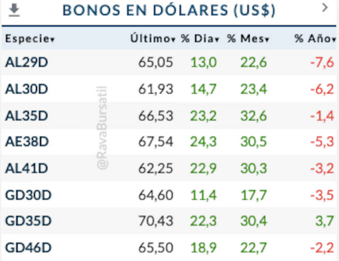 En esa línea, en Wall Street las cotizaciones en dólares de acciones y bonos argentinos también se dispararon.
