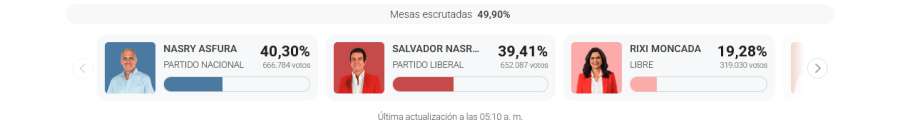De acuerdo con las cifras oficiales divulgadas por el Consejo Nacional Electoral, el candidato del Partido Nacional se impone con el 40% de los votos escrutados. Le siguen Salvador Nasralla, con 39%, y Rixi Moncada, con 19%