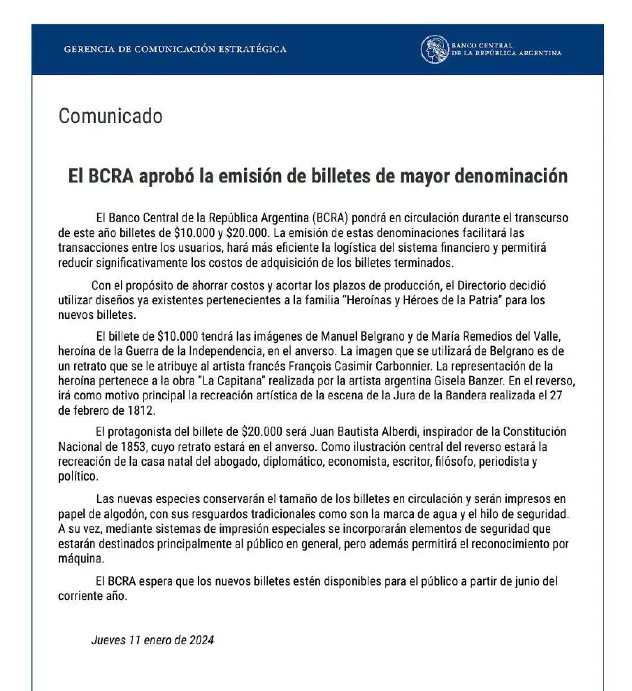 El Banco Central de la República Argentina (BCRA) anunció este jueves que pondrá en circulación durante el transcurso de este año billetes de 10.000 pesos y 20.000 pesos, con el objetivo de facilitar las transacciones entre los usuarios, hacer más eficiente la logística del sistema financiero y permitir reducir significativamente los costos de producción de los billetes terminados.