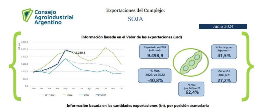 En el primer semestre del año, la cadena de valor sojera facturó 9.498 millones de dólares, un crecimiento interanual de 27,2%, mientras que si se comparan los meses de Junio, el crecimiento fue de 62,2%.