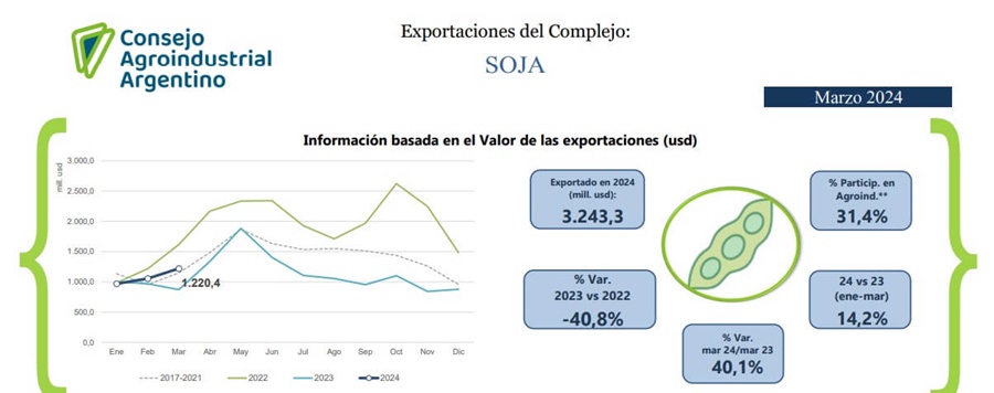 De acuerdo con un informe del Consejo Agroindustrial Argentino (CAA), los envíos de Marzo acumularon 3.727 millones de dólares.