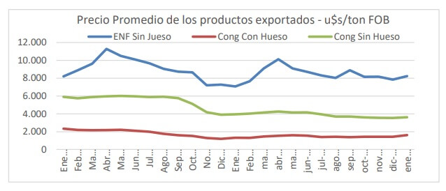 El precio promedio de exportación de carne bovina refrigerada y congelada durante el primer mes del año fue de 3.843 dólares por tonelada.