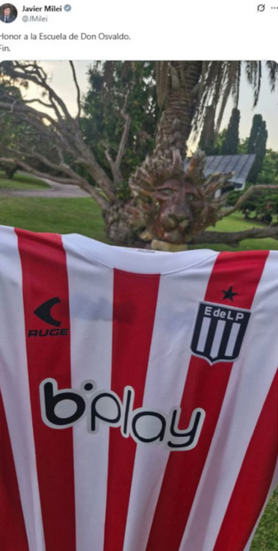 En los últimos días, Milei posteó mensajes en sus redes sociales en respaldo al Pincha, que tiene un enfrentamiento abierto entre Tapia y Juan Sebastián Verón, presidente de la institución platense. "Honor a la Escuela de Don Osvaldo“, escribió el mandatario en su cuenta de X acompañado por una camiseta albirroja.