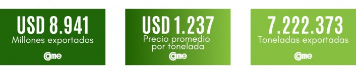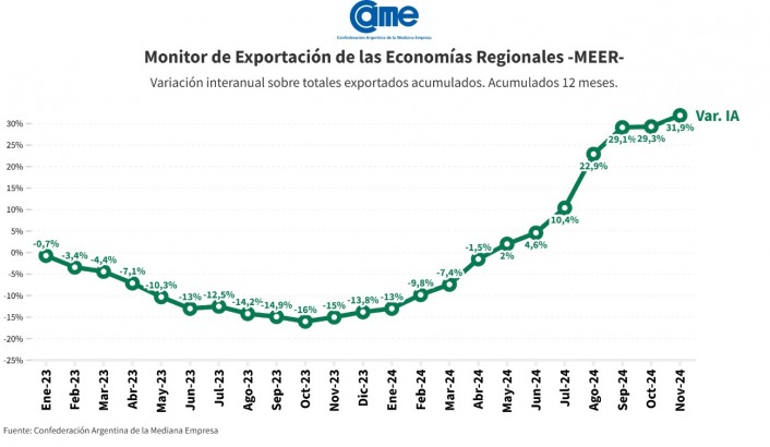 De acuerdo con el Monitor de Exportaciones de las Economías Regionales (MEER) elaborado por la Confederación Argentina de la Mediana Empresa (CAME), noviembre terminó con un incremento en las exportaciones de las economías regionales del 31,9% en dólares y del 24% en toneladas, lo que representa una suba interanual de 2.160,2 millones de dólares en el total exportado y de 1,4 millones de toneladas en el volumen comercializado. El precio promedio de exportación de las economías regionales argentinas se ubicó en 1.237 dólares.