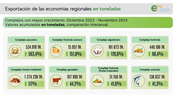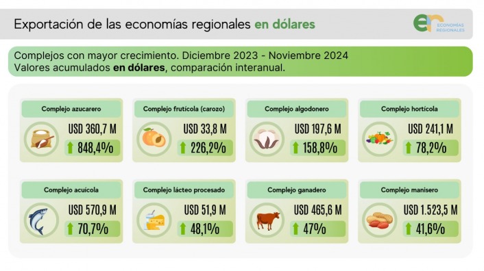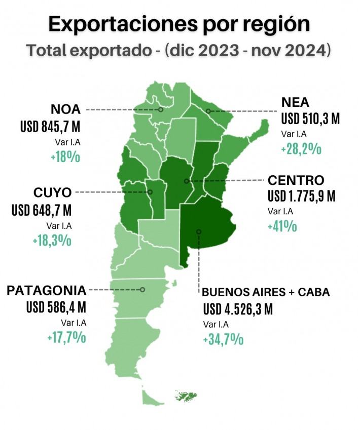 Con este incremento, las exportaciones regionales alcanzaron los 8.941 millones de dólares exportados en el período Diciembre 2023 – Noviembre 2024, habiendo importado USD 959 millones, lo que arroja un superávit comercial de 7.981 millones de dólares.
