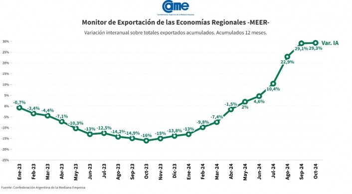 De acuerdo con el Monitor de Exportaciones de las Economías Regionales (MEER) elaborado por la Confederación Argentina de la Mediana Empresa (CAME), el mes de octubre terminó con un incremento en las exportaciones de las economías regionales del 29,3% en dólares y 23,4% en toneladas, lo que representa una suba interanual de 1.990,3 millones de dólares en el total exportado y de 1,3 millones de toneladas en el volumen comercializado. El precio promedio de exportación de las economías regionales argentinas se ubicó en 1.233 dólares.