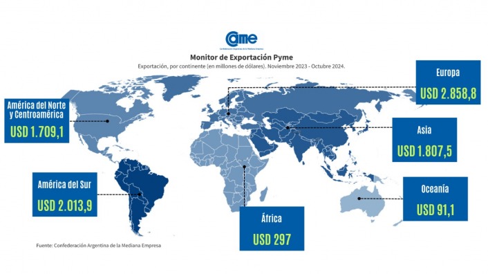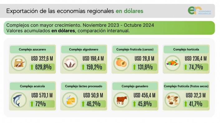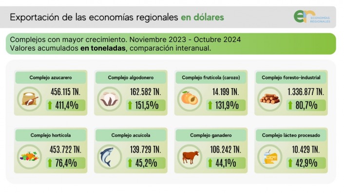 Con este incremento, las exportaciones regionales alcanzaron los 8.777 millones de dólares exportados en el período Noviembre 2023 – Octubre 2024, habiendo importado 914 millones de dólares, lo que arroja un superávit comercial de 7.863 millones de dólares.