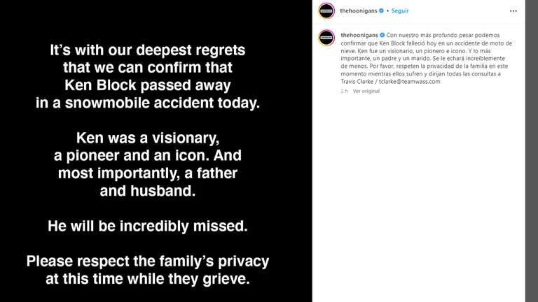 El comunicado difundido por el equipo de Ken Block en el que confirman su muerte.