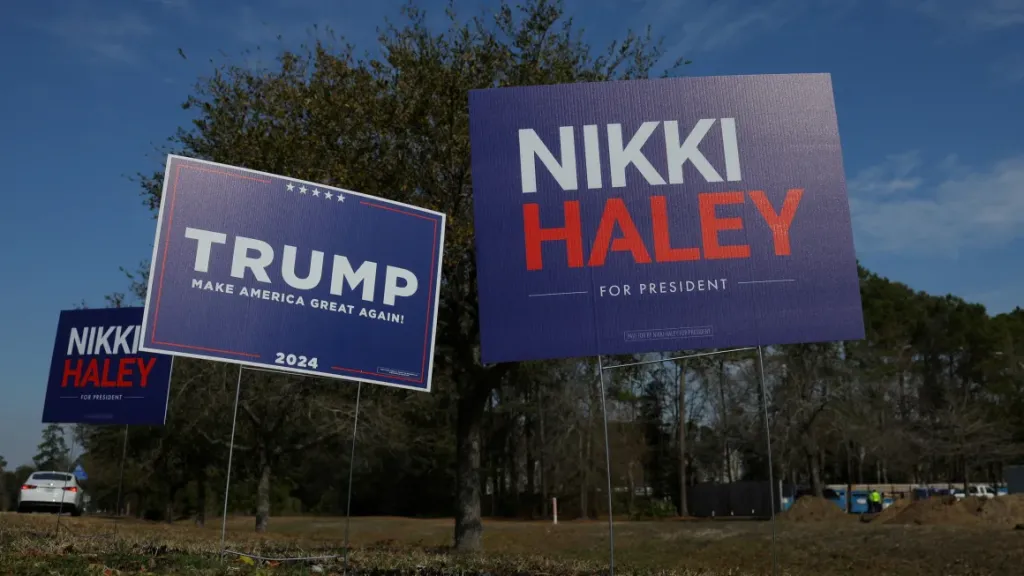 Foto de archivo: Carteles de campaña para los candidatos presidenciales republicanos, la ex embajadora de Estados Unidos ante las Naciones Unidas, Nikki Haley, y el ex presidente de Estados Unidos, Donald Trump, junto a una intersección en Mount Pleasant, Carolina del Sur, Estados Unidos, el 22 de febrero de 2024. Brian Snyder/Reuters