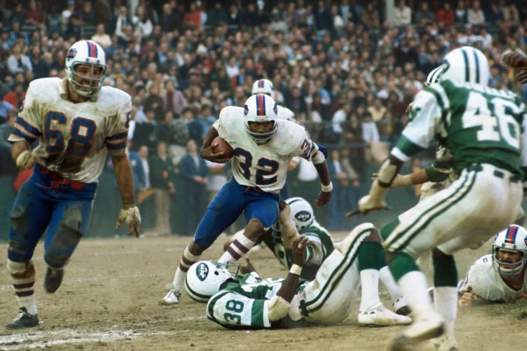 O.J. Simpson, jugando para los Buffalo Bills, corre contra los New York Jets. (Crédito: Focus on Sport vía Getty Images)