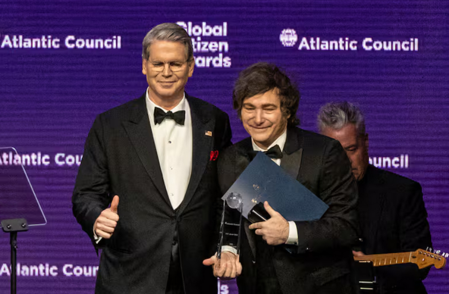 El Secretario del Tesoro de Estados Unidos, Scott Bessent, entrega un premio al Presidente de Argentina, Javier Milei, en Neva York. - Foto.- Stefan Jeremiah - FR171756 AP