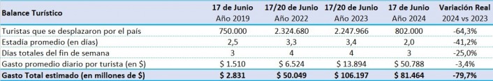 Los turistas gastaron en promedio 50.788 pesos diarios, 3,4% menos que en la misma fecha de 2023 (a precios reales) y tuvo una estadía media de 2 días, que también resultó por debajo de lo que es habitual en un fin de semana de 3 días (suele ser entre 2,2 y 2,5).