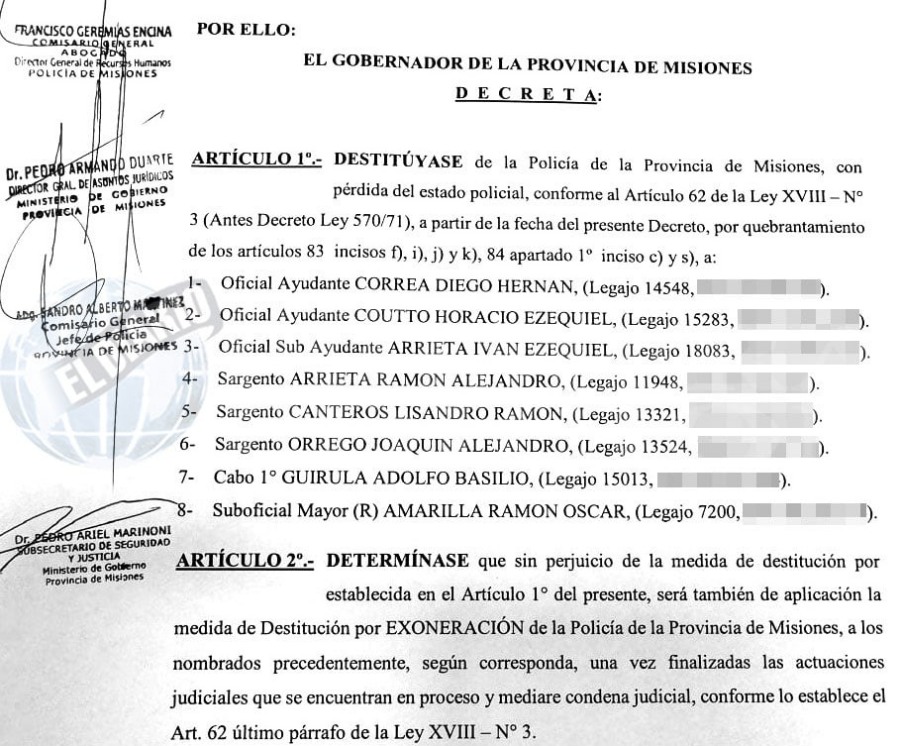 Con la firma del Gobernador, Hugo Passalacqua y el Ministro de Gobierno, Marcelo Pérez, el Gobierno de la provincia de Misiones decidió destituir a los ocho policías acusados de sedición y conspiración y dio de esta manera una rápida y efectiva respuesta al intento de sembrar el caos del cuál los detenidos era organizadores.