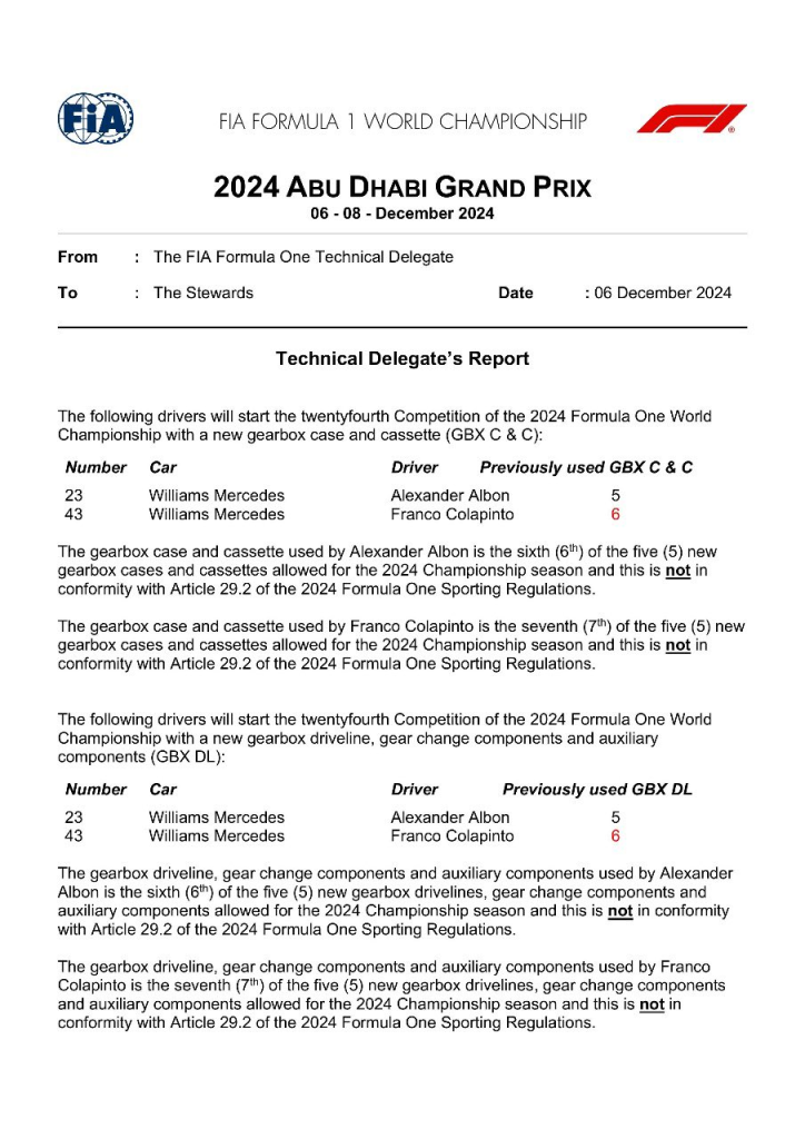 Williams informó por intermedio de sus redes sociales sobre el tema: “Alex y Franco sufrirán una penalización de 5 puestos en la parrilla de salida del Gran Premio de Abu Dhabi debido al uso de componentes adicionales de la caja de cambios RNC. Es una consecuencia desafortunada de los incidentes que ocurrieron durante el Gran Premio de la semana pasada, que estaban fuera del control de Alex y Franco, pero daremos lo mejor de nosotros para terminar la temporada con una nota alta”. De este modo, Alex y Franco afrontarán la clasificación de este sábado (desde las 11 de la mañana de Argentina) y quedarán ubicados en la parrilla de largada cinco puestos detrás del registro que logren en la Qualy.