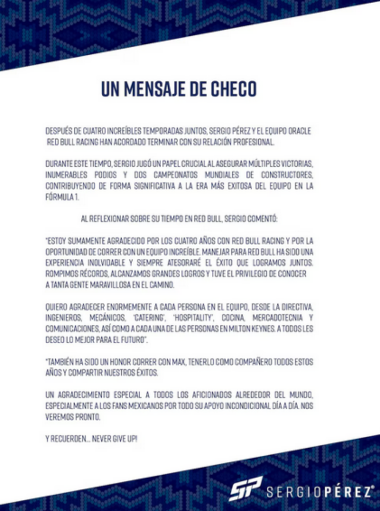 Minutos después del comunicado divulgado en las redes sociales de Checo Pérez, su - ahora - ex escudería escribió un escueto mensaje en su cuenta oficial de Twitter con la frase “gracias por todo Checo” y una mención al primer tramo de la misiva original, en el que se anuncia el adiós.