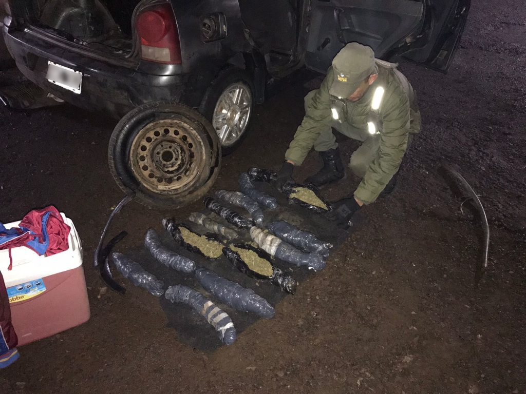 Conforme la inspección del rodado avanzaba se hizo evidente que dentro del mismo se percibía un aroma similar al de la marihuana. Las requisas, apoyadas por el can detector de narcóticos “Hilary”, llegaron hasta la rueda de auxilio, la cual estaba desinflada, y al presionarla se hizo más notorio el olor mencionado. Con conocimiento de las Autoridades Judiciales se accedió al interior del auxilio, en donde se encontraban ocultos 14 paquetes amorfos que contenían una sustancia vegetal. Finalizados los test químicos de campo, se obtuvieron resultados positivos para “Cannabis Sativa” con un peso de 3,700 kilos.